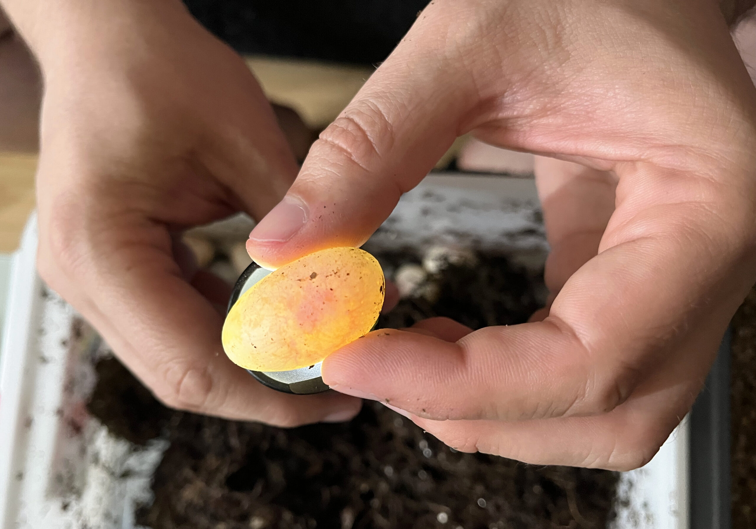 If you're unsure whether an egg is fertile just by looking or feeling, you can "candle" it to get a better idea. Candling is the process of shining a bright light (usually an LED flashlight) through the egg in a dark room to see what’s developing inside.